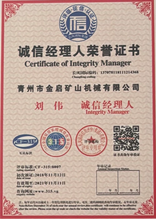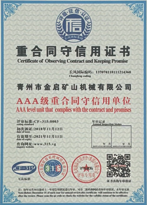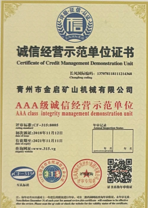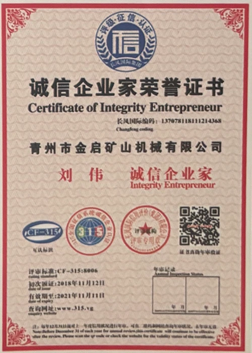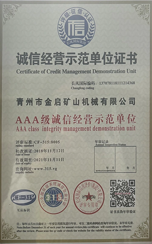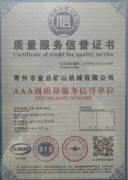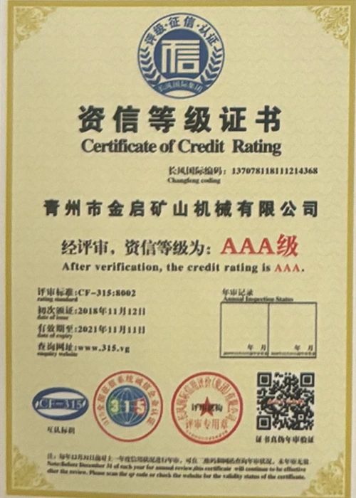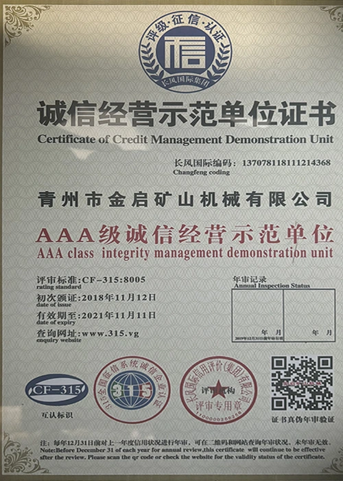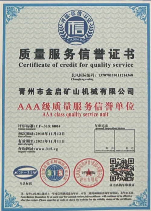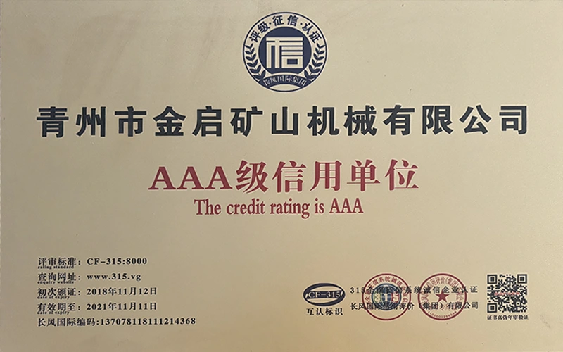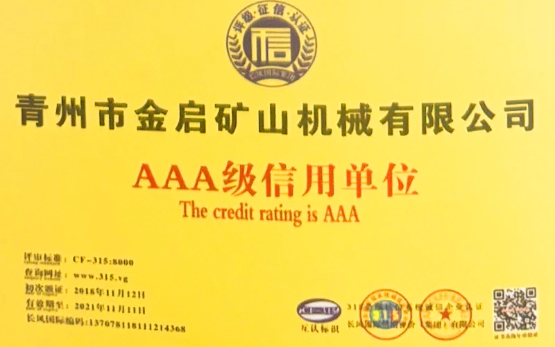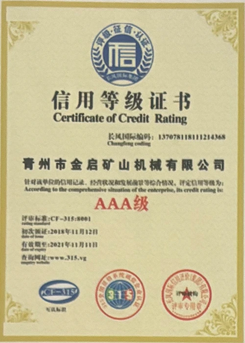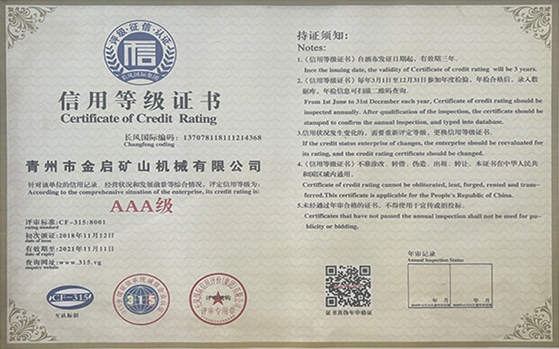 Con años de profunda experiencia en la industria, basándose en un estricto control de calidad y una innovación tecnológica continua, la compañía ha obtenido una serie de calificaciones, certificaciones y certificados de patentes autorizados, incluida la certificación del sistema de gestión de calidad ISO, la certificación de seguridad de productos mineros, así como múltiples patentes de invención y patentes de modelos de utilidad para la optimización de la estructura de los equipos y la actualización de la tecnología de ahorro de energía, lo que demuestra una gran solidez técnica y una garantía de producción conforme.