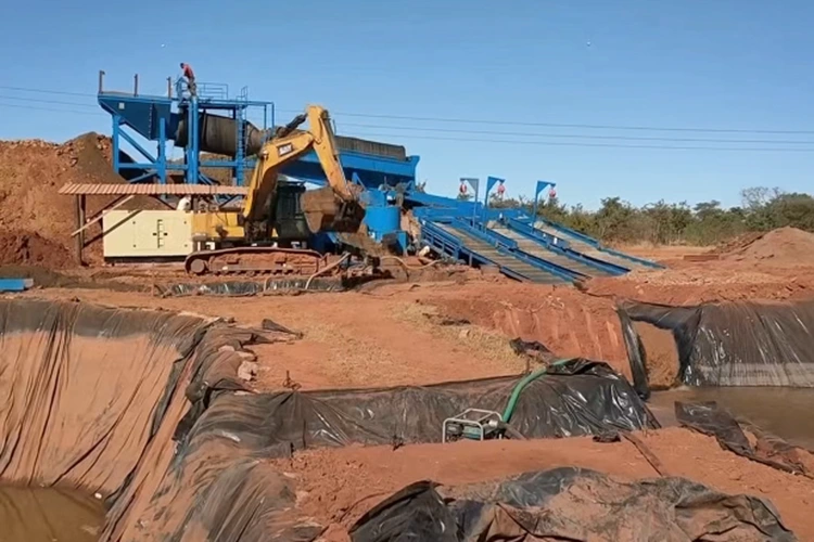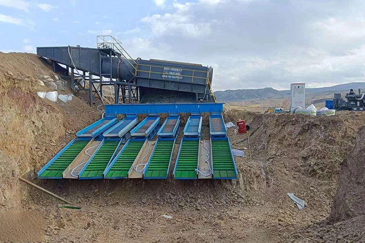 Planta móvil de extracción de oro: Es el equipo principal para la extracción de oro a placer en tierra, con reubicación flexible. Integra las funciones de proceso completo de alimentación, cribado y separación de oro. Después de que el trómel retira las piedras, la lechada de mineral se separa mediante equipos como cajas de esclusas y concentradores centrífugos.